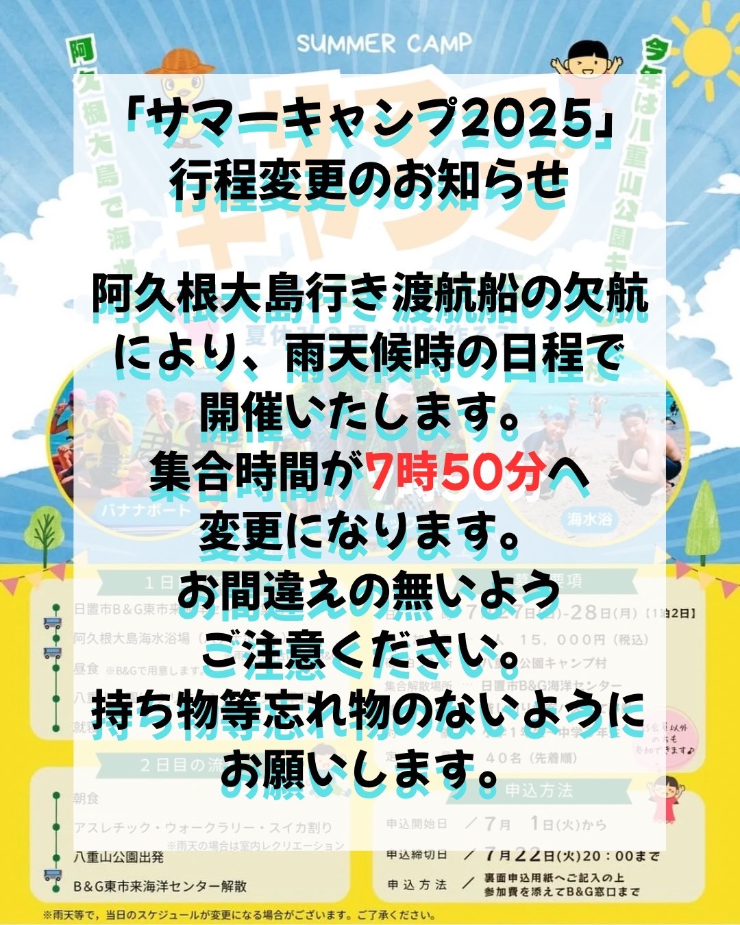 【サマーキャンプ行程変更のお知らせ】 7/27開催のサマーキャンプについて、 台風接近に伴う、阿久根大島行き渡航船欠航の為、 荒天時の行程での開催となりました。 集合時間が7時50分に変更になりますので、 お間違えの無いようご注意ください。 雨天時でも皆さまが楽しめるように、指導員一同いろいろ計画していま すのでお楽しみに! B&Gサマーキャンプお知らせ |